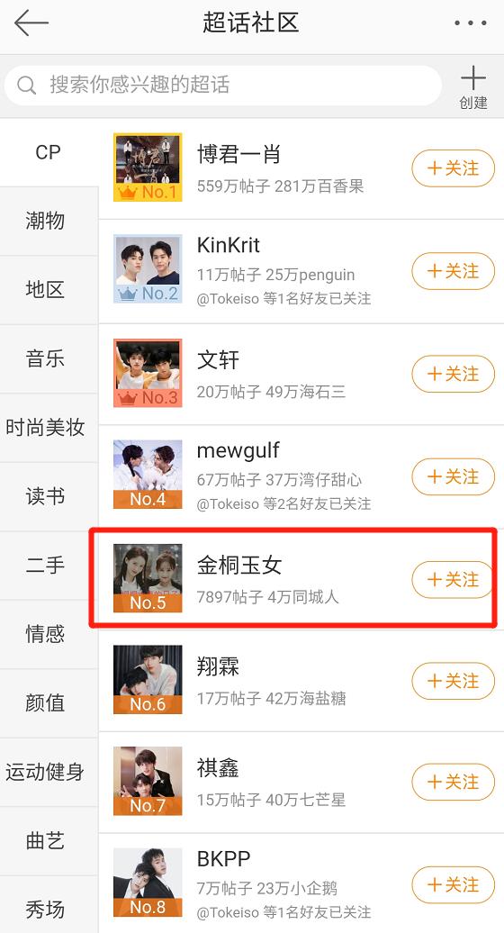 纵观微博CP超话排行榜,无一例外都是男男的CP,"金桐玉女"算是在这个排行榜中独树一帜的存在了!