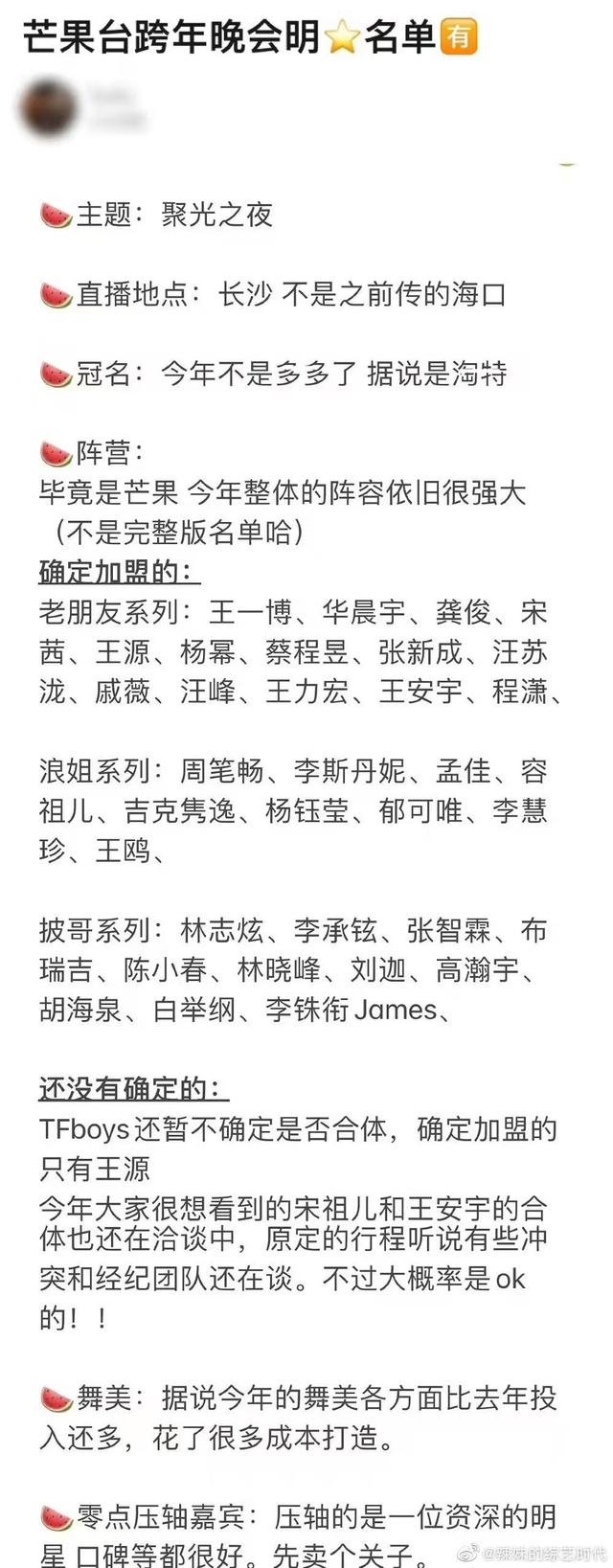 不过网上也有一份芒果台跨年的明星名单,确定加盟的有王一博、华晨宇等“老朋友”系列,还有“披哥”、“浪姐”系列明星。但这份名单明显不是最终确定版,至少王力宏是必然不会出现了。