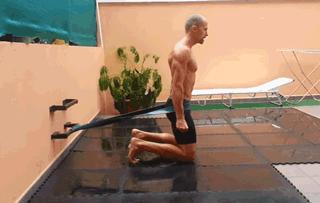 采用跪姿,将弹力带的一端绑在固定物上,高度约与髋关节同高,膝盖和双腿在同一条线上,避免膝盖内扣。