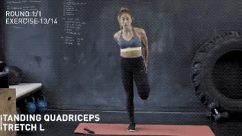 慢慢拉伸股四头肌,自然呼吸,不要憋气。维持30秒后,换另一侧进行。