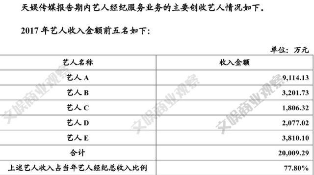 这2.57亿元经纪收入中谁贡献得最多?文娱商业观察找到一份表格,上面列出了2017年挣钱最多的前五名,虽然每个人都是以ABCDE代替,没有出现具体艺人的名字。