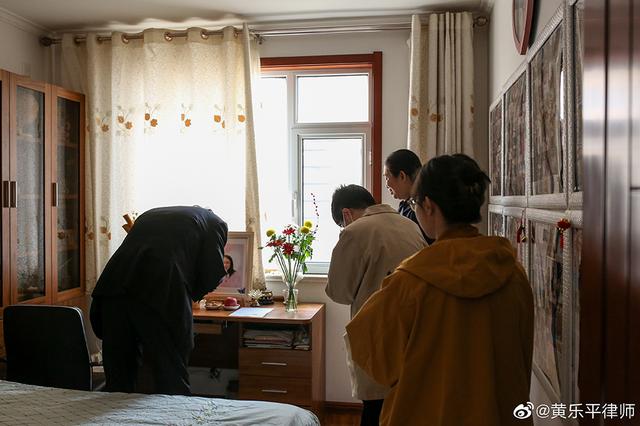 2021年4月16日,黄乐平律师团队第一次上门拜访江秋莲,在江歌的遗像前鞠躬致意。 受访者 供图
