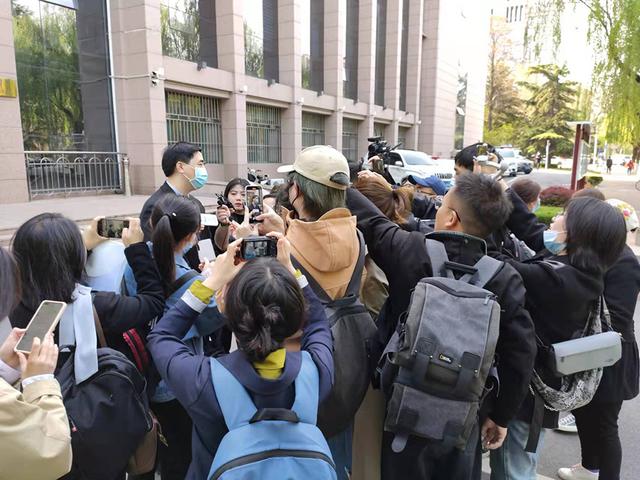 2021年4月15日开庭前,黄乐平律师被媒体包围。 张小莲 摄