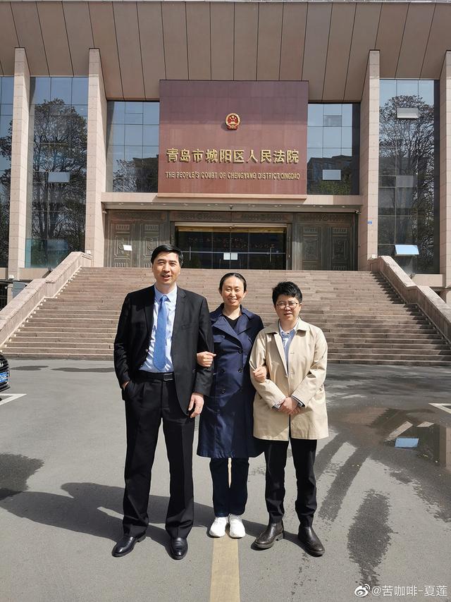 2021年4月16日,开完庭第二天,江秋莲与黄乐平律师、李婧律师在城阳区法院门口合影留念。 受访者 供图