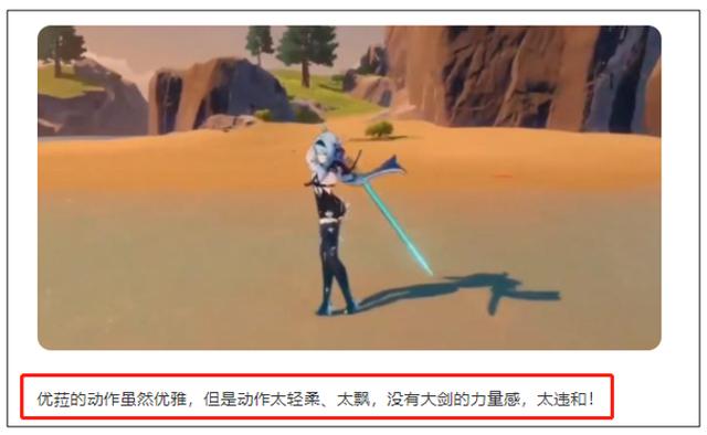 在现实中,由于内鬼作祟,不少玩家都提前看到了优菈的大剑攻击动作。虽然动作很优雅,但也遭受了大量的抨击:动作太轻柔、太飘,没有大剑的力量感,太违和!