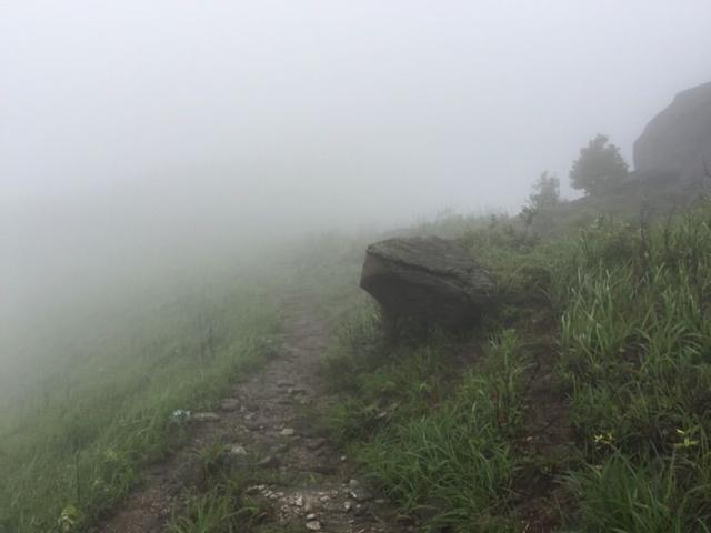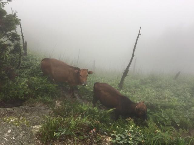此时雾霭起来了,能见度只有三四米,看不到前方,幸好山梁上牛走的道还是比较清澈,顺着牛走过的道,按指南针指的方向前进