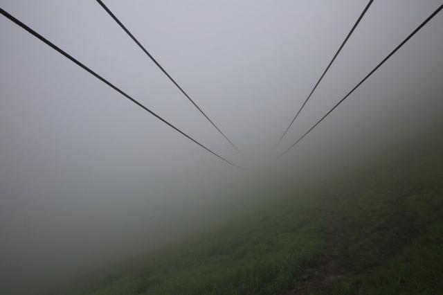 经过九龙山庄,走上熟悉的道路,但是浓雾重重,在上山梁不幸迷路,上到往安福方向去了,幸好长沙小伙子手机下载了六只脚的轨迹,发现轨迹不对,及时修正,转到正确方向。经过铁蹄峰客栈,十一点半到金顶景区。