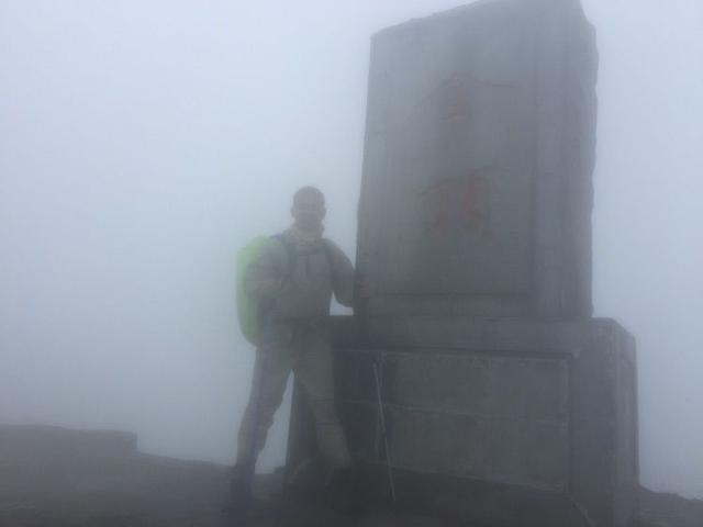 站在金顶石碑上,浓雾蒙蒙罩住了山顶,请人在浓雾的石碑边留影,此地海拔1918米