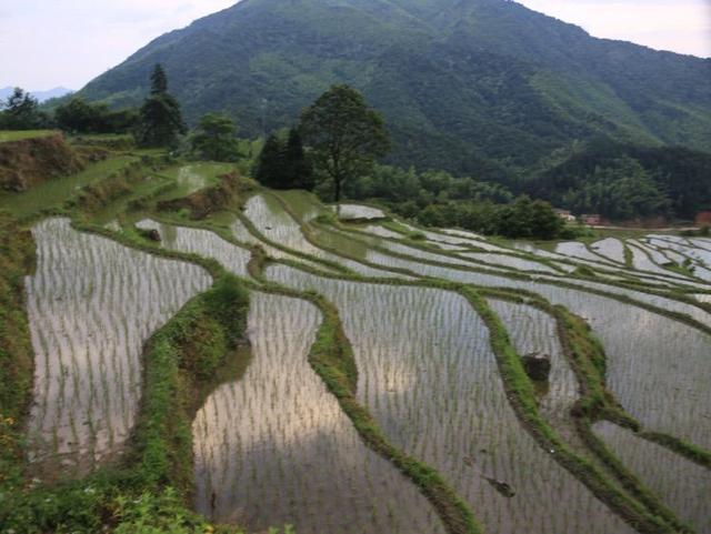 路边一块平整的巨石下面,灌满了水的一坡梯田象一面镜子,弯弯的不规则的田埂在上面画着优美的线条,如果天气好,拍摄效果绝对不输那些景点的二线梯田。若是住上一段时间,说不定也得不知晋魏了。
