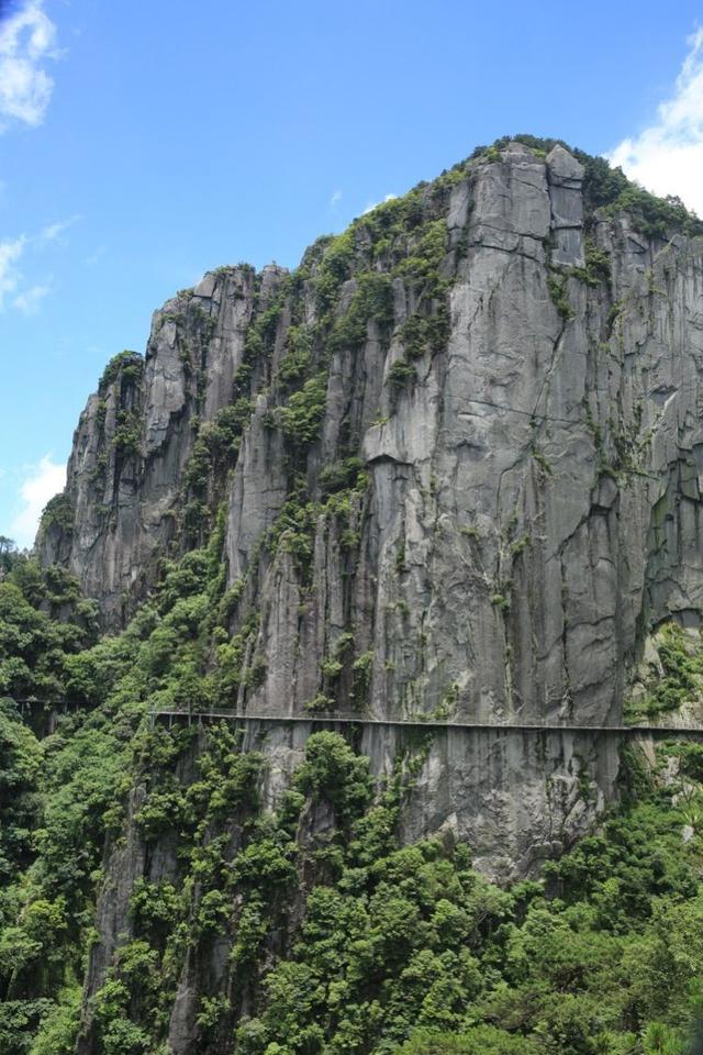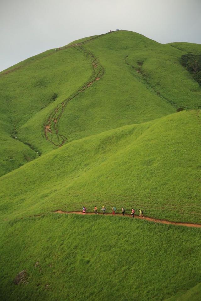 一队赶路的驴友,一会功夫登上山顶,惊叹人类的伟大,凭着一双脚不停地上升下降,一会消失在远方。
