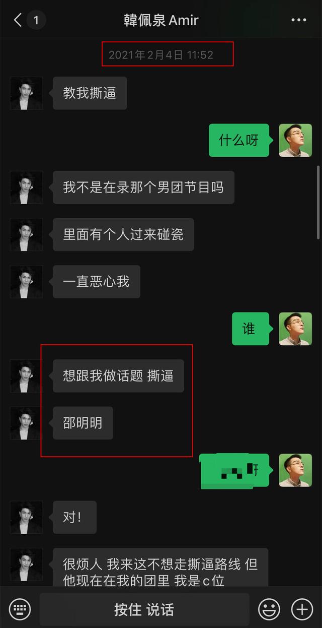 这个时候,韩佩泉的好朋友胡宾果为了帮他“打抱不平”,晒出了两人此前的聊天记录,记录中韩佩泉说邵明明想跟他做话题、碰瓷。