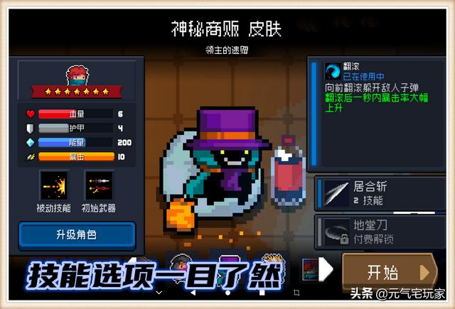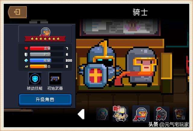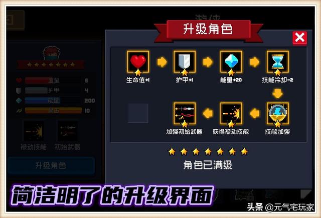 而除了以上职业技能和皮肤界面之外,最让老宅青睐的当属那简洁明了的职业升阶页面了。因为对于新手玩家来说,《元气骑士》最难上手的除了复杂的职业和数百种实力不明的武器装备之外,职业技能、实力选择、星级提升所带来的变化更是一无所知,就算如老宅这般的老玩家,也忘了当初给职业升7星,具体提升的都是什么。