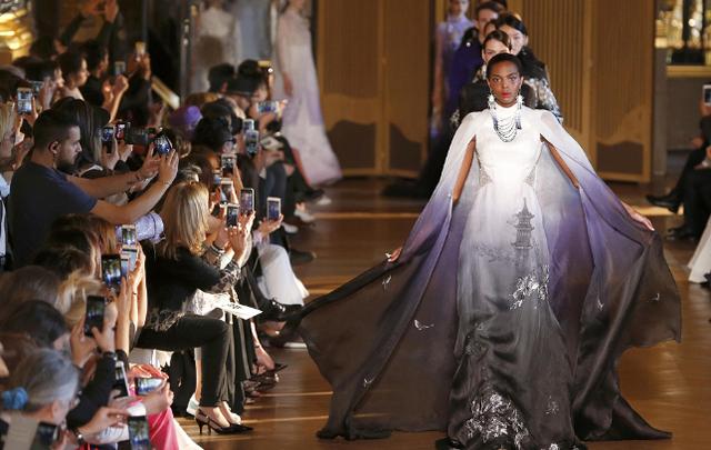 ,而且水墨往往色彩比较淡,以灰黑两色为主,所以在进行创造的时候,为了能够让水墨元素更好的融入到衣服中,服装的面料跟色彩也是大有讲究。