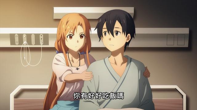 最让各位开心的是,终于轮到了桐人和亚丝娜秀恩爱的环节,在UW世界里,两人的很多互动都被制作组以“不符合气氛”为由删掉了,如今回到现实世界后,两人的关系又回到了老夫老妻的模式,桐人在医院躺了一个月后,亚丝娜捧着花前来探望,展现了她对桐人无微不至的关心。