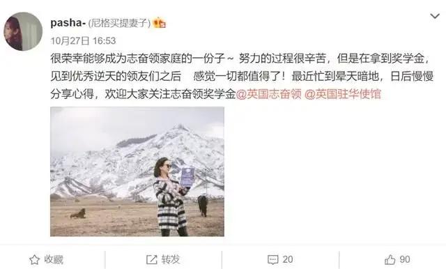 2010年,尼格买提的妻子在社交平台上晒出自己取得了英国志奋领奖学金,真的是非常优秀了。