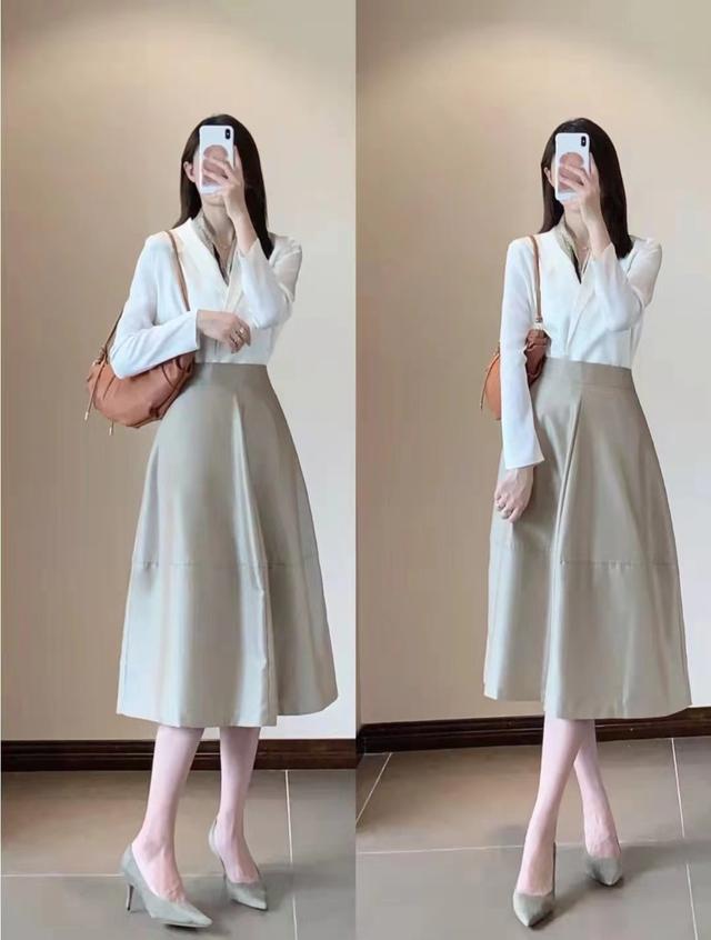 因为亚洲女性一般都是梨型身材,所以在穿搭上面,更要学会扬长避短。像这种A字裙,既可以巧妙的遮挡住身材上面的劣势,还可以调节身型,尤其是在上半身,搭配一件v领衬衫,领口处帮助拉长了身线,也会让身材显得更加挺拔,同时还可以将上衣塞进裙子里,这样即使是小个子女生,也可以给大家带来大长腿的假象。