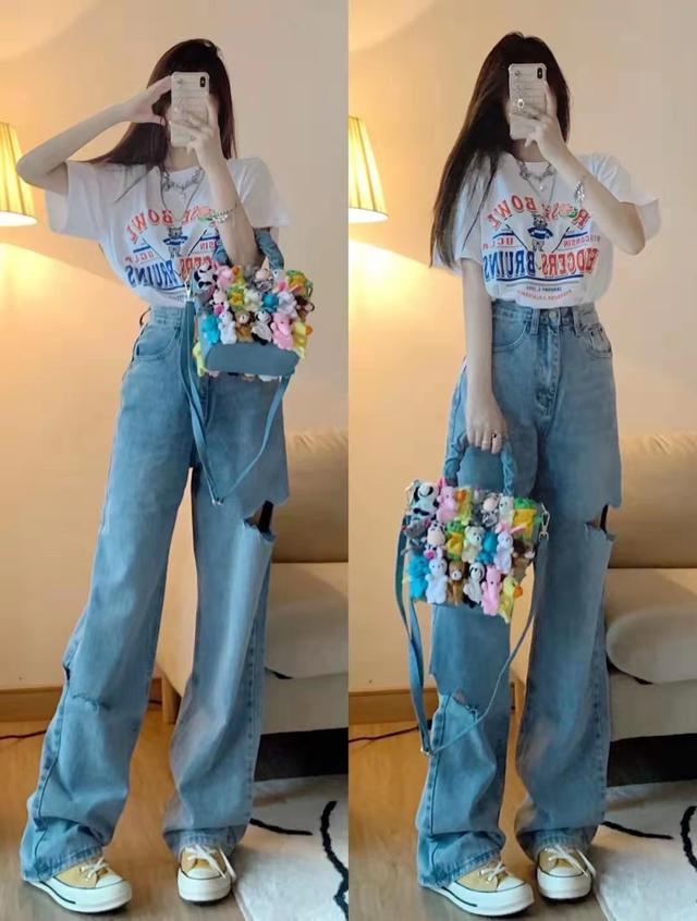选择日常的穿搭,主要是以轻松简单为主,像白色T恤与牛仔裤,服装搭配起来比较百搭,而且款式大方。如果认为基础款,穿起来显得平平无奇。那么可以选择这种白色印花T恤,颜色既显干净,还带有减龄的效果,下面配上一条破洞牛仔阔腿裤,整体呈现出一种时髦的韵味,不仅特别耐看,还可以体现穿搭水平。