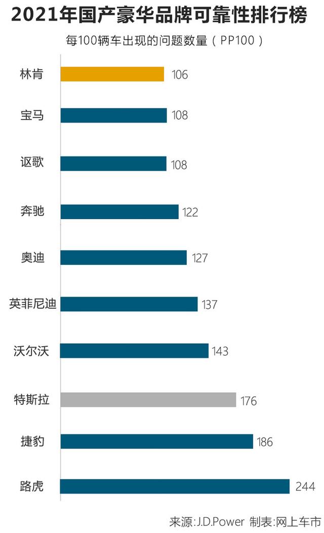 国内消费者买车除了关心性价比外,可靠性也是需要去考虑的因素之一。近日,J.D.Power发布了最新的2021年美国汽车可靠性研究报告,榜单中品牌的可靠性是由每100辆车出现的问题数量所决定,分数越低代表着质量越优秀。网上车市通过梳理榜单中已经国产的十大豪华品牌后发现,林肯品牌的可靠性最佳,成功夺冠,在产品质量上超过了宝马、奔驰、奥迪、沃尔沃等品牌。