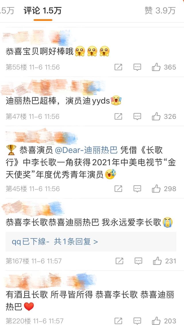 得知迪丽热巴获奖后的粉丝很激动,表示“演员迪yyds”……