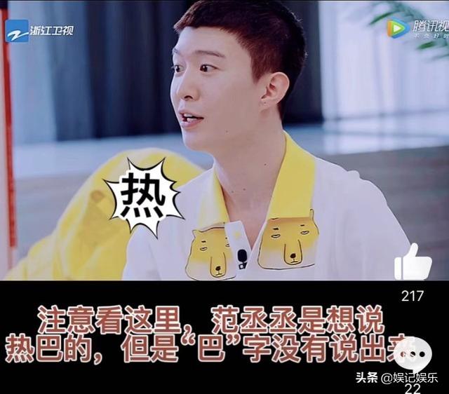 话说范丞丞简直就是电视机前八卦的网友本人呀,因为范丞丞在节目中不止一次提到热巴,上次提问环节,杨洋问杨迪平时看什么八卦,范丞丞在一旁给杨迪提示,说了一个“热”字,显然是想说“热巴”。