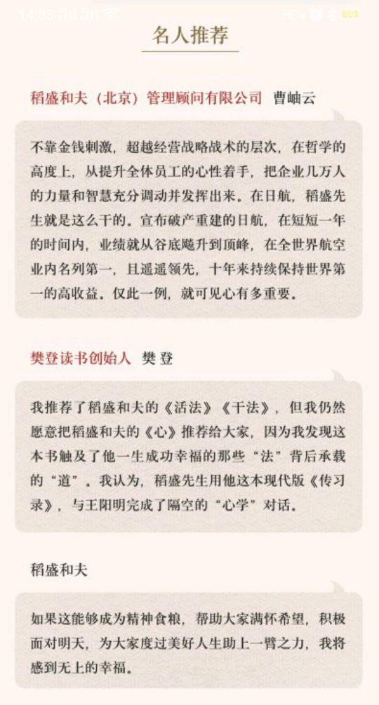 我推荐了稻盛和夫的《活法》《干法》,但我仍然愿一把稻盛和夫的《心》推荐给大家,因为我发现这本书触及了他一生成功幸福的那些“法”背后承载的“道”。我认为,稻盛先生用他这本现代版《传习录》,与王阳明完成了隔空的“心学”对话。