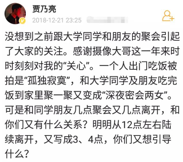 虽然贾乃亮说这只是和大学同学以及朋友的聚会,而且零点开始大家就陆续回家,并非凌晨三四点,但绯闻还是没消停。
