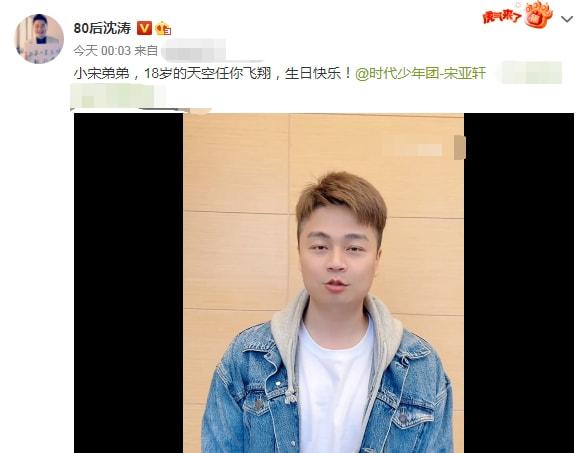 这位给小宋送祝福的就是他的师父沈涛,只见沈老师在零点三分的时候发了条动态,配文是:小宋弟弟,18岁的天空任你飞翔,生日快乐!在录制的祝福视频中,沈老师还祝福了小宋高考能考出好的成绩。