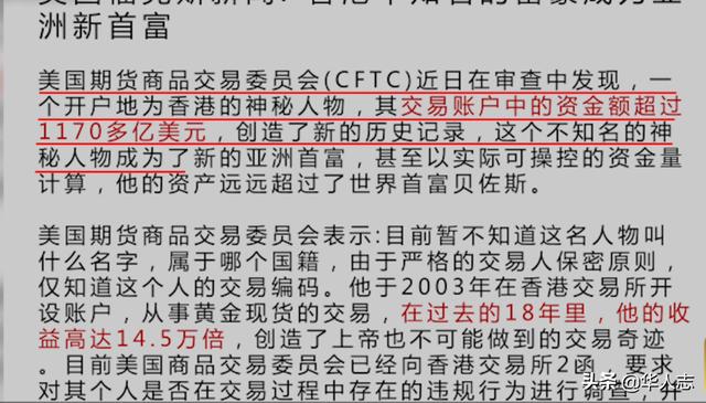 2021年6月17日,有一条消息在华人投资圈疯狂传播,有人在网上发文说,据美国福克斯新闻报道,美国期货商品交易委员会在审查中发现,一个开户地为香港的神秘人物,其交易账户中的资金额超过1170亿美元。这个财富可以排进世界前五,亚洲第一。