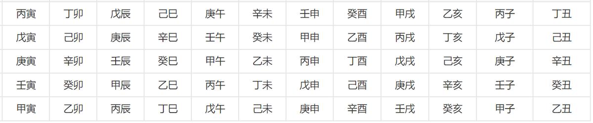 答案是对应表格,五年一轮回,从甲开头的年份到戊开头的年份5年轮回一次,然后从己开头的年份到癸开头的年份5年再一轮回。