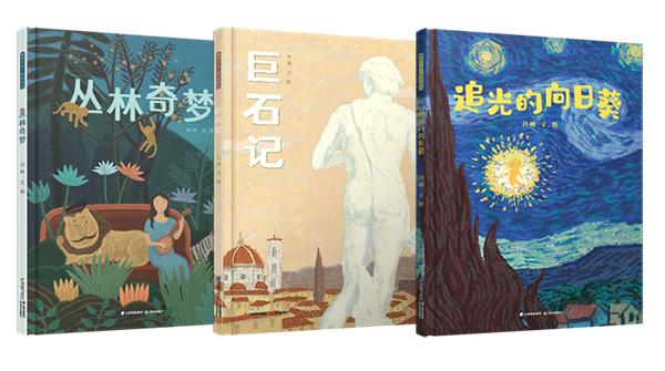 刘皞的“艺术启蒙系列绘本”,目前已出版四册,分别是《阳伞卡蜜儿》、《追光的向日葵》、《巨石记》和《丛林奇梦》,这些绘本将名家名作与虚拟故事巧妙结合,在讲艺术的同时讲故事。