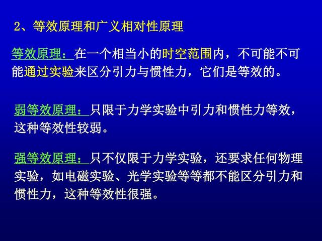 等效原理说起来不难,但这却是一个谜,到现在为止仍然是个假设!因为它说的是惯性力场与引力场局部不可分辨,也就是以一个G的重力加速度下落,一个G的加速度飞船中,惯性力和重力加速度是等效的,连爱因斯坦也不知道这是为啥,但事实上就是这样!