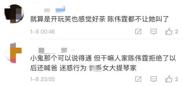 这次在《潮流合伙人》中,欧阳娜娜开口叫陈伟霆爸爸。陈伟霆明显很不情愿,直接表示拒绝让她不要再叫,但是欧阳娜娜充耳不闻,依然我行我素的继续叫爸爸。陈伟霆也不好多说,只能假装没听见。