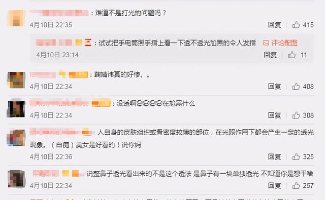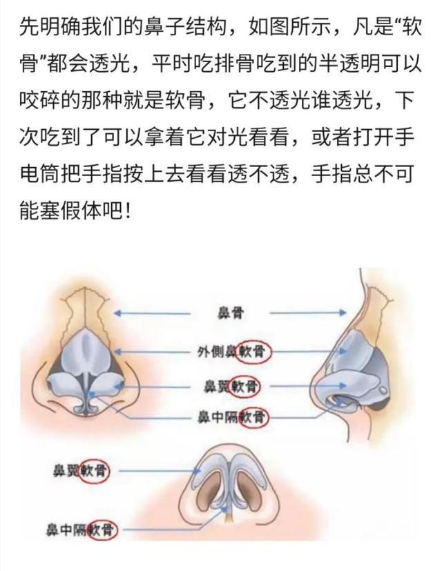 但也网友认为鼻子透光是属于正常现象,但凡“软骨”都会透光。就像我们把手电筒打开把手按上去也会透光,所以手指总不可能是假体吧。