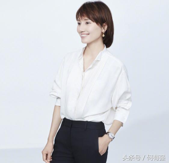 9:袁泉的穿衣搭配比较时尚职场女性,一件白衬衫搭配一条黑色的西装裤,让你气质满满。