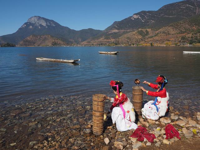 神奇的土地孕育了勤劳善良的摩梭人,一直延续着母系大家庭文化和“男不娶、女不嫁”的走婚习俗。每年农历七月二十五是摩梭人传统的转山节,当天摩梭人身着盛装欢聚在格姆女神山下,祭拜格姆女神,唱着“阿哈巴拉”欢歌,跳着千人“甲搓舞”。