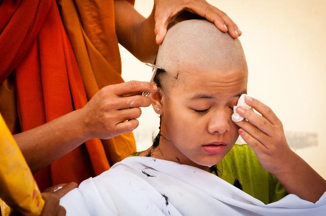 一个正在接受剃度仪式的女孩,用纸巾擦着眼泪。