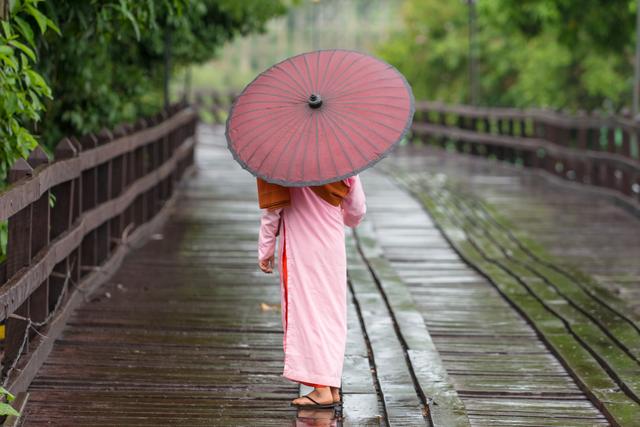 在人们的印象中,尼姑一般都穿着灰色长袍,或者是土黄色的,身上背着个小布包,常常显得无精打采。而缅甸的尼姑,都穿着粉红色长袍,里面衬着一条鲜艳的橙红色的长纱笼,肩上披着一条橙黄色的长围巾,怀里抱着化缘的钵,一排排走过,她们穿过斑驳的树影,穿过长长的街道,