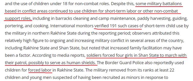 在冲突不断上演的地区,军队强迫儿童进行短期劳动或进行其它非战斗支持的情况并不少见。更有甚者,据媒体报道,曾有武装力量强迫掸邦的四名女孩与巡逻队一起游行,极有可能将其作为肉盾防护。