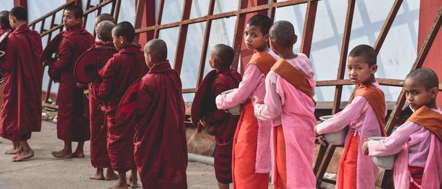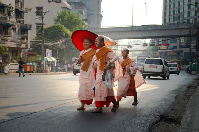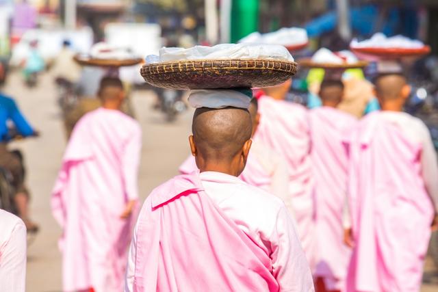 走在缅甸的街头,人们常会不自觉地被一道靓丽的风景所吸引,那就是随处可见的尼姑。她们穿着粉红色的长袍,常常排成一排,在大街上化缘。当她们走来的时候,人们就会把食物放进她们的钵里,尼姑们道谢之后,安静地离开。