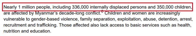 根据2021年联合国儿童基金会公布的《针对儿童的人道主义援助行动》,目前有约33.6万个难民,和35万个儿童向联合国发出求救信号,其中妇女和儿童最易受到两性暴力、流离失所、剥削、性侵、拘留、逮捕、征兵和拐卖等的伤害。