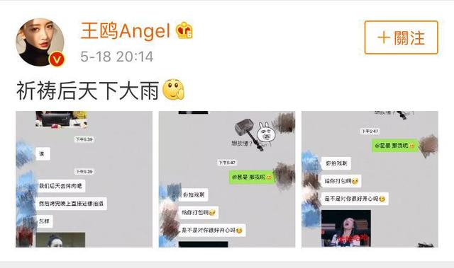 王鸥在微博晒出与自己工作室同事的聊天记录并且称“希望后天下大雨”,工作室回应称“祈祷后天晴空万里”。