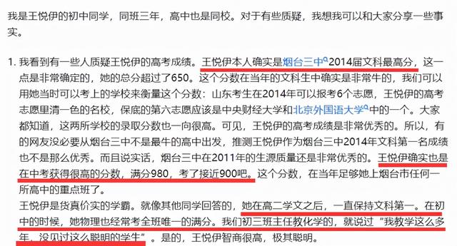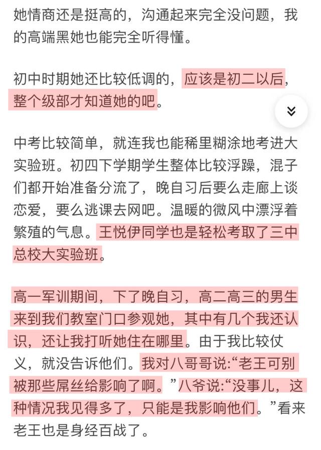 爆料者是王悦伊的初中高中同学,她直言很佩服王悦伊,经常玩但丝毫不影响学习成绩,上学期间也很调皮叛逆,因上课时说话被老师赶出过课堂,也因衣着不符合校规被通报批评,但她的学习成绩一直很好,高一分班前一直是班级前三名,高二基本就稳居班级第一,高三是全文科第一,最后考取了中国传媒大学。