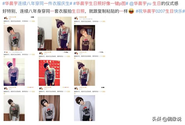 华晨宇有个习惯,每年生日都会穿同一件毛衣晒照,这个习惯延续了八年,今年也是一样。他是个长情的人,一件毛衣都可以保存八年,并在生日这一天找出来穿给粉丝看,小细节最能体现心理,温暖又长情。而从这八年的照片中,也能看出华晨宇的成长变化,幼稚的脸庞逐渐变成熟,肩膀变宽了,也越来越强大。