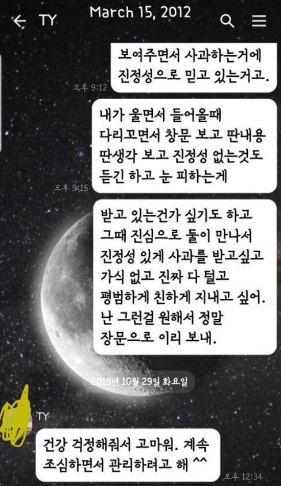 原本以为泰容言行争议就这样以和解告终。但在今年的6月,举报者B某再次登场。B某主张“泰容的道歉没有诚意” ,作为证据他公开了2019年10月28日发给泰容的短信,但举报者B某编辑了短信的相关内容,造成了误解。