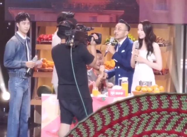 当时迪丽热巴、刘宇宁和天天兄弟等人正在认真介绍着助农产品,突然有个人从后面跑上舞台,碰了下热巴的胳膊。热巴和主持人们回头望过去,就看见这人拿着一枚戒指冲着热巴跪下去,疑似上演“求婚戏码”。
