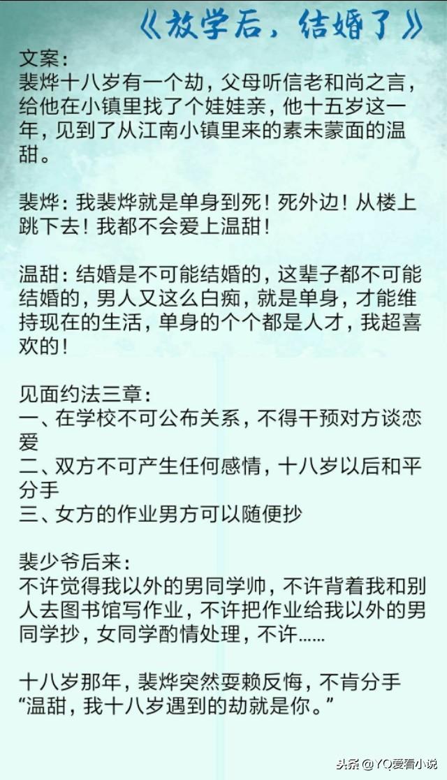 YQ简评:这篇超甜,是校园言情,一个从校服到婚纱的故事,女主是学霸,男主是校霸,男女主是娃娃亲,男主一开始是很抗拒女主的,后来接触之后就啪啪打脸了,男主忠犬小狼狗,两个人在一起配一脸啊,小说全文无虐,剧情线和感情线都是轻松风格的,是一篇适合闲暇时候放松的小甜文。