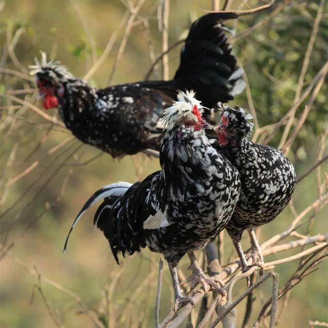 贵妃鸡原产于英国,是专供皇室享用的美味,属欧洲名优特禽品种,极具观赏价值。其体型娇小玲珑,阿娜多姿,全身有着艳丽的黑白花羽毛,头上有一华丽毛冠,形似欧洲贵妃的帽子,又似我国古代皇妃的凤冠,所以有"贵妃鸡"、"贵妇鸡"、"皇家鸡"之称。