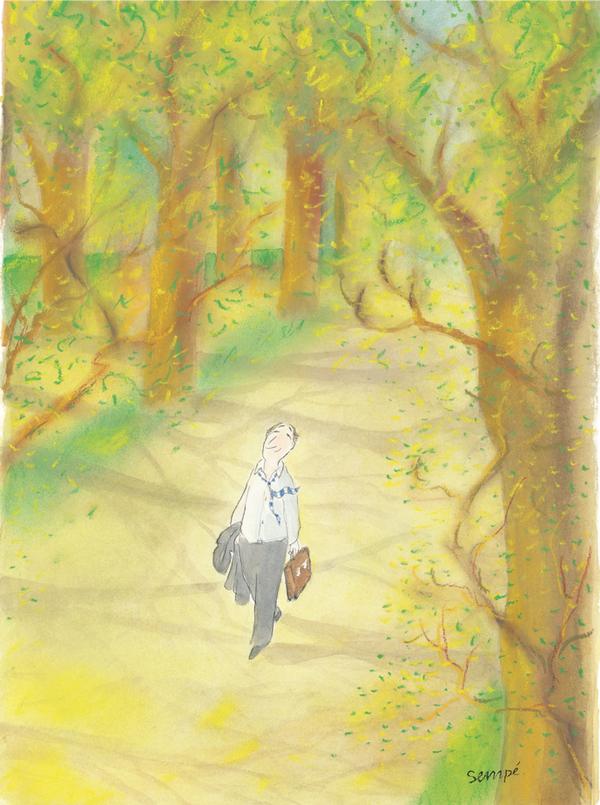 任凌云说:“桑贝的画表现力非常强,很准确。其中有一张是他在树林里走,《中年男人》那张,他自己也说这张改了特别多遍,小人儿走路的姿势他修整很多次,要传达出一个很疲惫的人忽然在树林感受到不知道是清风还是鸟声、气味,他有一种忽然轻松的感觉,你会觉得整张画的幸福感特别特别强,虽然他的快乐只是一点点。”