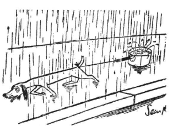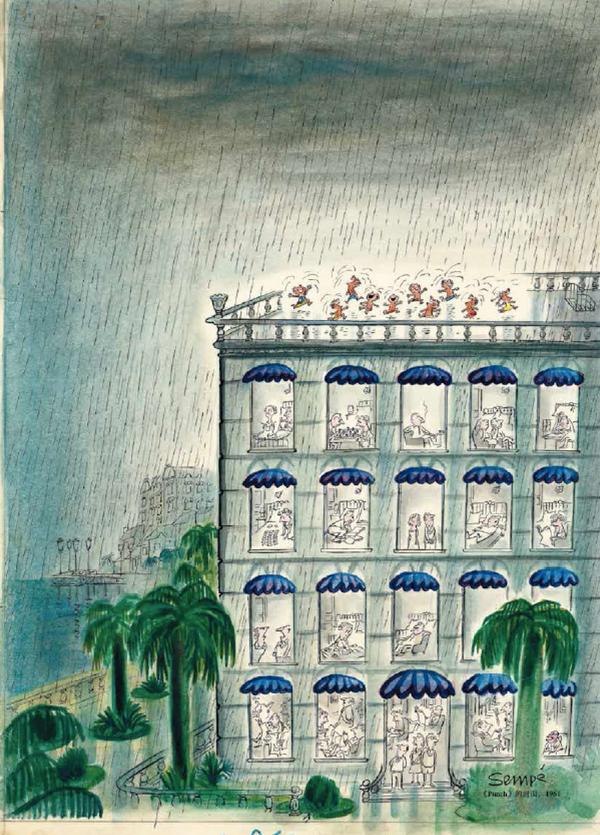 桑贝说他从来不嘲讽,他反讽但不嘲讽,他不是居高临下尖锐地去批判什么人,他的幽默里始终带着这种善意的、温暖的、忧伤的一面,就好像有些事情你没有办法,但是大家都了解,我们都一样的那种感觉。“有一幅画是一个大楼,下大雨,小孩在屋顶跳来跳去,底下是这个公寓楼里每个成年人的人生百态。你知道有一天楼上的小孩会变成楼下的那些人,但是你看着楼上的小孩都忍不住高兴。”陈赛说。