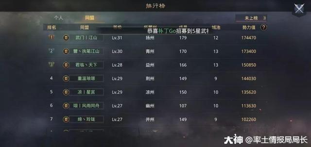 ,扬州【武门】一直分兵作战,被多盟夹攻,但是仍能领跑同盟排行榜,在多处战场与各大同盟打得有来有回,这是胜利的坚厚基石。第二点是内部的团结